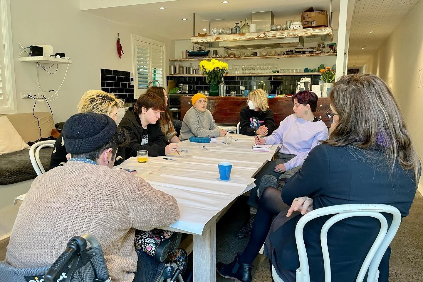 The issue 01 committee sits around a table covered in butcher’s paper. From left to right: Mac Zamani, Theo Warner, Ronan Miles, Rossamund Brennan, Aud Mason-Hyde, Alice Maio-Mackay, Freya Occleshaw and Eloise Brook.