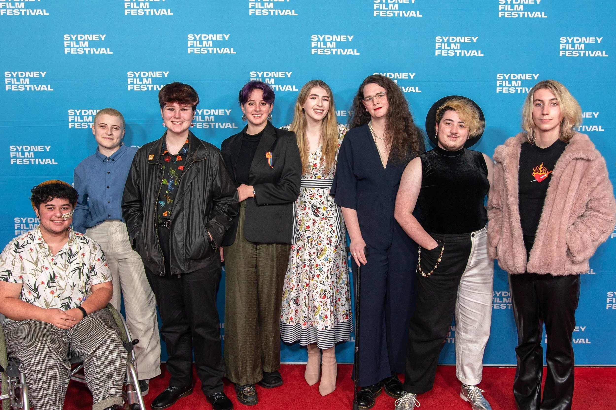 Below: the Issue 01 committee with Georgie Stone on the Sydney Film Festival red carpet for the premiere of the documentary in 2022. From left to right: Mac Zamani, Aud Mason-Hyde, Ronan Miles, Freya Occleshaw, Georgie Stone, Rossamünd Brennan, Theo Warner and Alice Maio-Mackay.