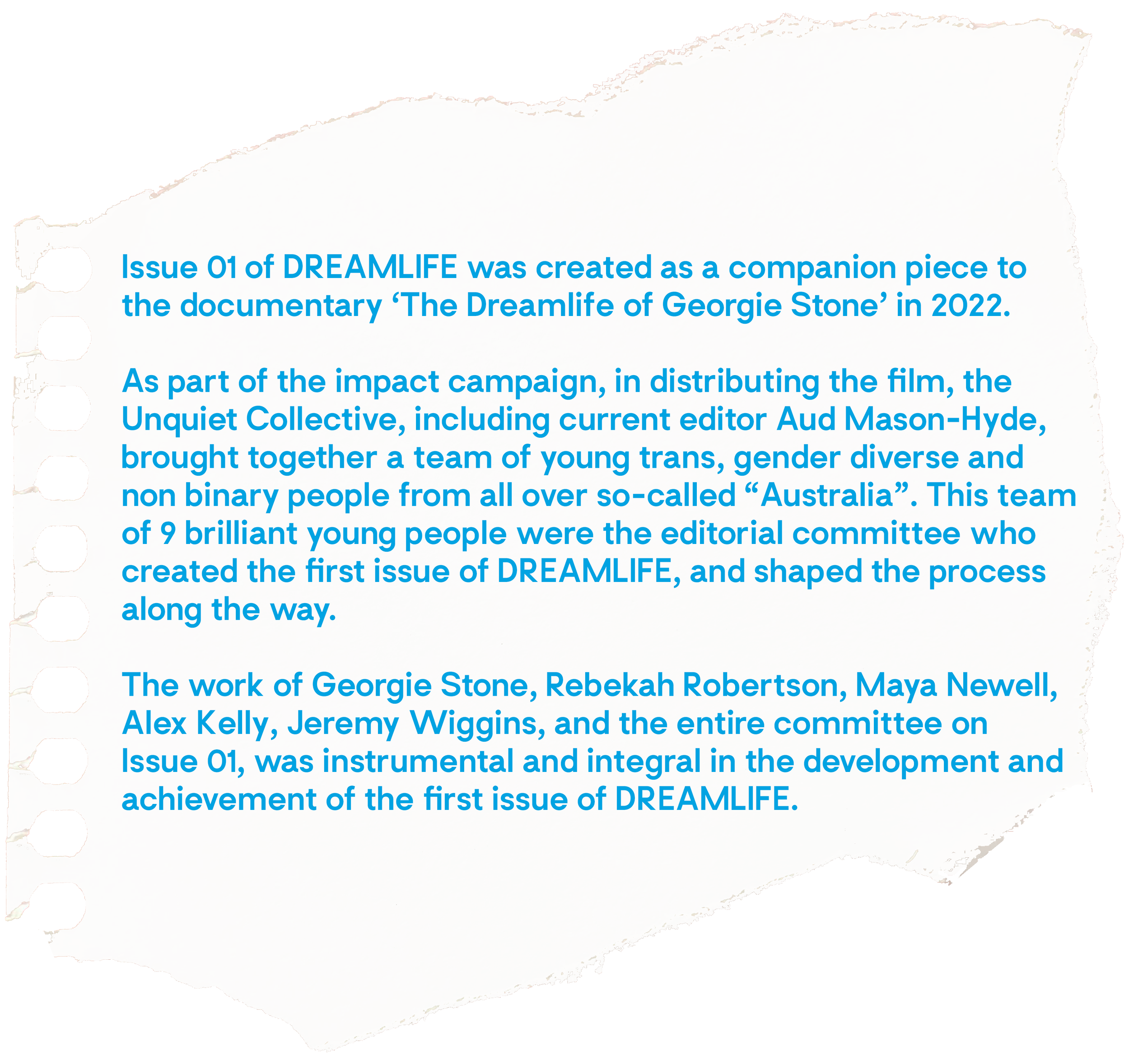 DREAMLIFE is an artefact of the beauty and multiplicity of young trans, gender diverse, and non-binary people. A physical zine steps out of the cluttered digital space and allows us to anthologise our stories, which are diverse and not monolithic, and proliferate trans narratives which are complex, joyful, messy, genuine, and liberatory.